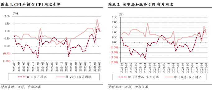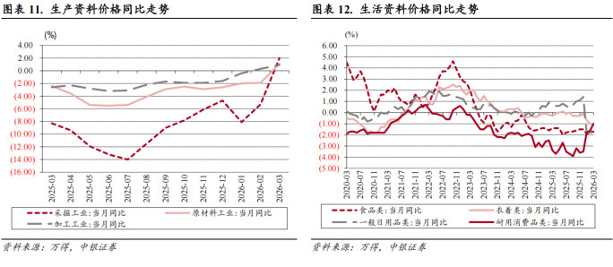 春节因素消退影响食品和服务价格,输入性因素影响工业消费品价格。从3月同比看:食品中,鲜菜、牛肉、羊肉和鲜果合计影响CPI同比上涨约0.24个百分点,猪肉和鸡蛋合计影响CPI同比下降约0.23个百分点;服务价格影响CPI同比上涨约0.36个百分点;工业消费品价格影响CPI同比上涨约0.67个百分点,其中汽油价格影响CPI同比上涨约0.11个百分点,黄金饰品价格涨幅回落10.8个百分点,但仍上涨65.8%。从3月环比看:食品影响CPI环比下降约0.48个百分点,服务影响CPI环比下降约0.51个百分点;调控后汽油价格影响CPI环比上涨约0.31个百分点。考虑到国内有成品油调价机制,预计国际油价波动对我国CPI的影响程度可能有所减弱,但从2026年全年来看,食品价格偏低和内需释放缓慢,可能持续拖累CPI同比增速表现,在不调整油价预期的情况下,我们预计年内CPI同比增速或仍将在0.5%-1.0%区间波动。