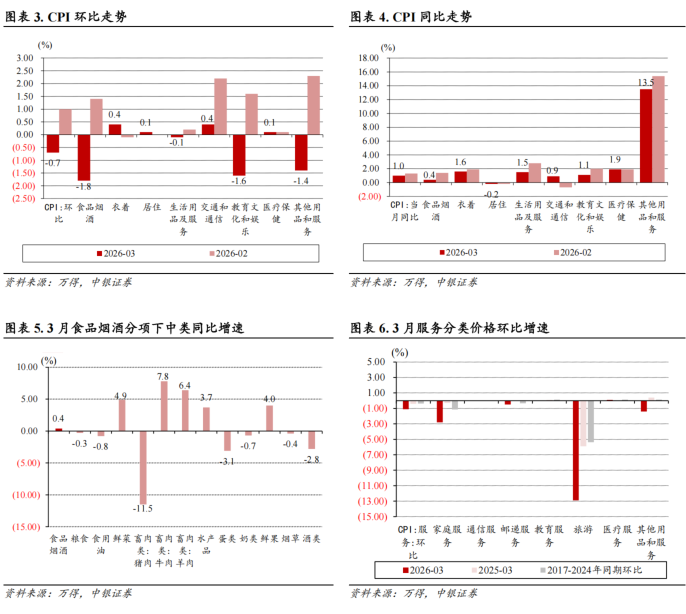 3月CPI同比增速低于万得一致预期,增速较2月下行。3月CPI环比下降0.7%,增速较2月下降1.7个百分点。从分项环比看,3月环比上涨的包括衣着(0.4%)、交通通信(0.4%)、居住(0.1%)、医疗保健(0.1%),环比增速下降的包括生活用品及服务(-0.1%)、其他用品和服务(-1.4%)、教育文化娱乐(-1.6%)、食品烟酒(-1.8%);3月分项中较2月环比增速上升的有衣着、居住,环比增速下降的有生活用品及服务、交通通信、食品烟酒、教育文化娱乐、其他用品和服务,医疗保健环比增速持平于2月。3月CPI同比增长1.0%,较2月下降0.3个百分点,核心CPI同比增长1.1%,较2月下降0.7个百分点,服务价格同比增长0.8%,较2月下降0.8个百分点,消费品价格同比增长1.3%,较2月上升0.2个百分点。从分项同比看,3月同比增长的是其他用品和服务(13.5%)、医疗保健(1.9%)、衣着(1.6%)、生活用品及服务(1.5%)、教育文化娱乐(1.1%)、交通通信(0.9%)、食品烟酒(0.4%),同比下降的仅有居住(-0.2%),同比增速较2月上升的仅有交通通信,同比增速较2月下降的有衣着、教育文化娱乐、食品烟酒、生活用品及服务、其他用品和服务,居住和医疗保健同比增速较2月持平。